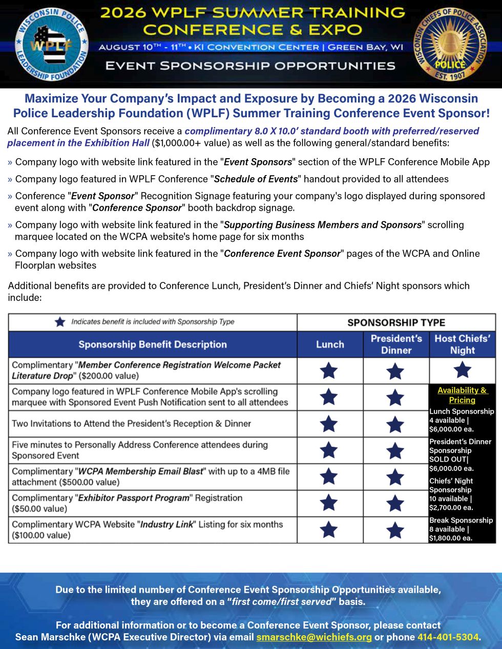 For additional information about becoming a 2026 WPLF Summer Training Conference Event Sponsor, please contact Sean Marschke (WCPA Executive Director and WPLF Conference Coordinator) via email [email protected] or phone 414-401-5304.